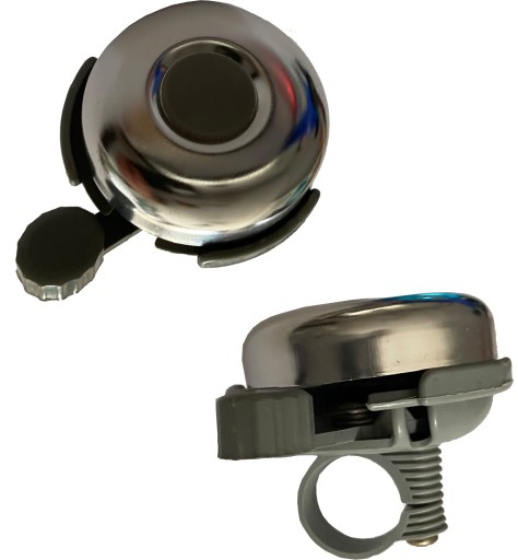 Głośny, metalowy dzwonek rowerowy, posiada uniwersalny uchwyt mocowany do kierownicy.
