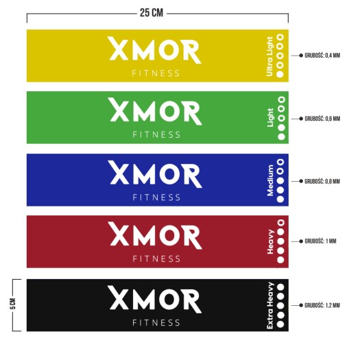 Gumy mini bands marki XMOR FITNESS to zestaw pięciu krótkich gum (o obwodzie 50 cm), które mają zastosowanie w różnego rodzaju ćwiczeniach. Dzięki wszechstronności i dużej skuteczności są stosowane przez sportowców w różnych dyscyplinach, począwszy na lekkiej atletyce aż po gry zespołowe w tym między innymi w piłce nożnej. Ze względu na swój rozmiar i kształt nadają się do ćwiczeń rozgrzewkowych, rehabilitacyjnych i aktywacyjnych. Taśmy są dedykowane wszystkim osobom trenującym – na każdym poziomie zaawansowania. Dzięki różnym oporom gum, każdy może dostosować trening do swoich możliwości. Połączenie wszystkich gum MINI BANDS XMOR umożliwi Tobie wykonywanie różnorodnych ćwiczeń z łatwą regulacją poziomu trudności.