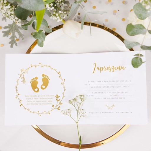 Przepiękne zaproszenia na Chrzest z motywem stópek w eleganckim wianuszku. Zaproszenia wykonane zostały z dbałością o najmniejszy szczegół w biało-złotej kolorystyce. Taka propozycja wpisuje się w najmodniejsze tendy w rustykalnym stylu.