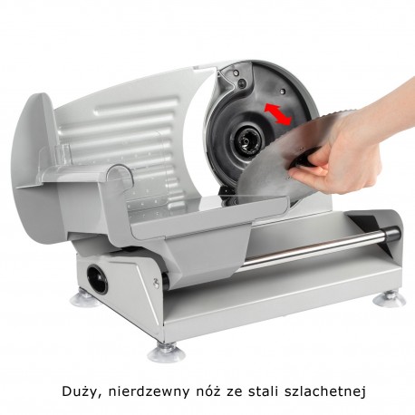 Obudowa krajalnicy odlana jest z metalu - dzięki temu jest stabilna i trwała. Dodatkowo spód zabezpieczony jest przez gumowe przyssawki, utrudniające przesuwanie lub przypadkowe zrzucenie urządzenia.