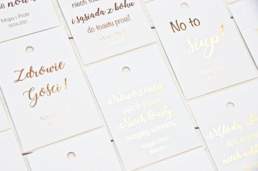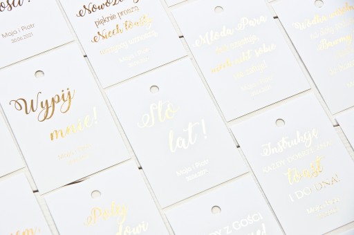 - Tekst na zawieszkach jest uszlachetniony złotą folią