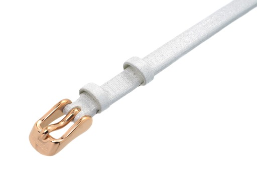 Oryginalny pasek do zegarka marki Fossil Georgia Mini do modelu ES3754 wykonany ze skóry naturalnej w kolorze srebrnym, gładki, jednoczęściowy, bez przeszycia, sprzączka wykonana ze stali nierdzewnej w kolorze różowe złoto z napisem Fossil.
