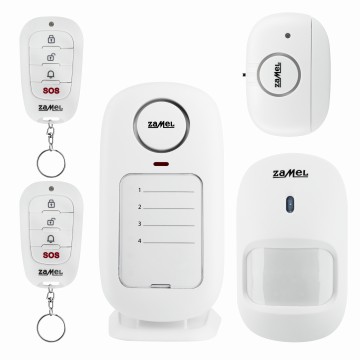 Zestaw alarmowy ZAM-350 służy do prostej ochrony pomieszczeń przed niepożądanym dostępem osób trzecich. Dzięki zasilaniu bateryjnemu i technice bezprzewodowej pozwala w bardzo prosty i nieinwazyjny sposób na rozmieszczenie poszczególnych elementów systemu w dogodnych miejscach chronionego obiektu. Wyzwolenie któregoś z czujników (czujniki ruchu, czujniki otwarcia drzwi lub okien) powoduje załączenie głośnego sygnału alarmowego w centralce oraz odpowiedniej diody LED w tej centralce wskazującej który z czujników został wyzwolony (dając informacje użytkownikowi w którym pomieszczeniu pojawił się problem). Do jednej centralki można maksymalnie zaprogramować 2 piloty i 6 czujników. Zasięg systemu (max odległość między centralką a czujnikami) to ok 100 m w terenie otwartym.