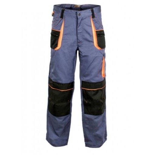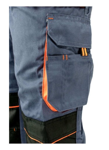 Spodnie do pasa zapinane na guzik. Wykonane z tkaniny poliestrowo-bawełnianej. W pasie guziki umożliwiające regulację obwodu. Na kolanach wzmocnienia z tkaniny o podwyższonej odporności na ścieranie. Spodnie wyposażone w praktyczne kieszenie i zasobniki