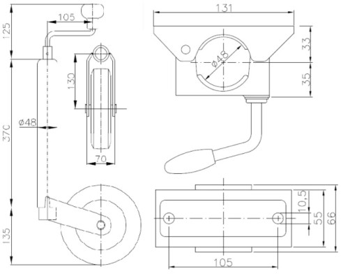 Mocna i ergonomiczna rękojeść ułatwia rozkręcanie koła i manewrowanie przyczepą