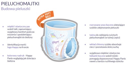 - Easy on/Easy off - łatwe w zakładaniu i zdejmowaniu. Elastyczny pas wokół talii zapewnia idealne dopasowanie w każdej pozycji. Wyjątkowo miękkie i elastyczne falbanki boczne wokół nóżek, pomagają dopasować Happy Pants nawet u bardzo ruchliwego dziecka. Szwy boczne ułatwiają szybkie zdejmowanie poprzez rozdarcie. Specjalna tasiemka do zaklejania zużytych Happy Pants ułatwia pozbycie się pieluchomjatek w higieniczny sposób.