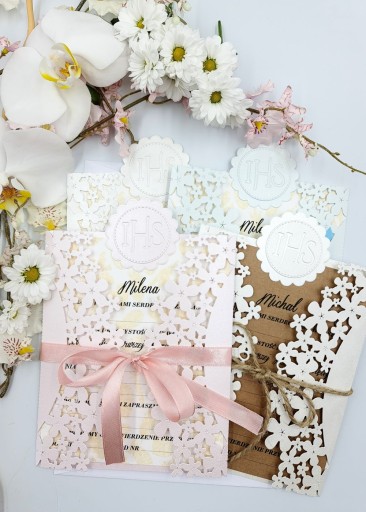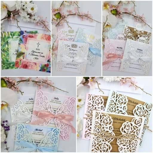 PRZEDMIOTEM SPRZEDAŻY SĄ PIĘKNE ZAPROSZENIA KOMUNIJNE AŻUROWE. JEDYNE W SWOIM RODZAJU. WYKONANE Z NAJWYŻSZEJ JAKOŚCI PAPIERU. ZAPROSZENIA MAJĄ WYDRUKOWANE WYBRANE PRZEZ PAŃSTWO IMIĘ DZIECKA TAK BY TYLKO WYPISAĆ INNE INFORMACJE TAKIE JAK: IMIĘ I NAZWISKO ZAPRASZANEJ OSOBY, DATA, MIEJSCE. KOLOR BIAŁY Z WKŁĄDKĄ EKO. INNE KOLORY NA POZOSTAŁYCH AUKCJACH.