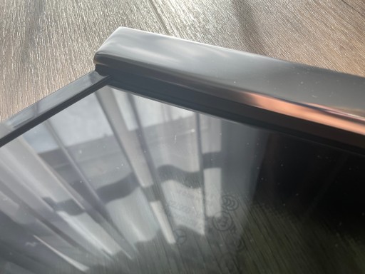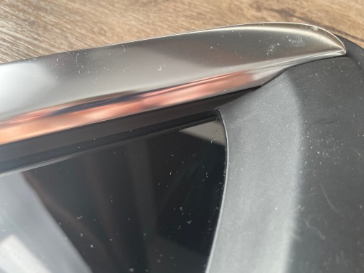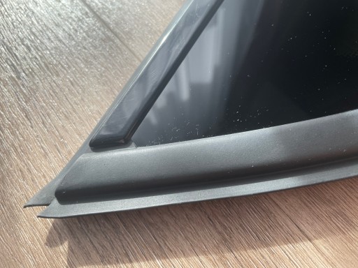Szyba lewa - nieprzyciemniona, demontaż z rocznika 2014. Delikatne ryski czarnej listwy pionowej, widoczne odbarwienia listwy chromowanej. Od wewnątrz naderwana końcówka uszczelki, matowe wykończenie łuku nosi drobne ślady użytkowania. Szkło bez większych rys czy odprysków.