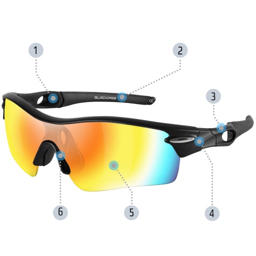- hipoalergiczny silikonowy nosek i okładziny zauszników (zapobiegają zsuwaniu się okularów podczas jazdy lub biegania - doskonałe na szosę i do wszelkich odmian MTB, jak również do biegania, triathlonu i codziennego użytku)