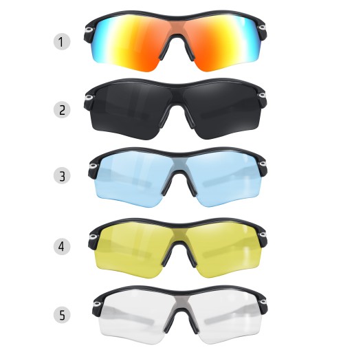 Okulary rowerowe UV400 + 5 wymiennych szkieł. Oprawki wykonane z Grilamidu TR90 - materiału o wyjątkowej odporności na zginanie i rozciąganie. Kolor: czarny mat