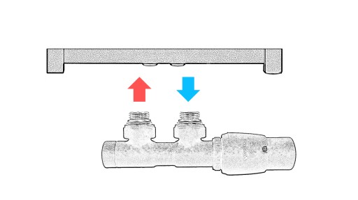 Zawór prawy jest skierowany głowicą w prawą stronę. Zasilanie tego zaworu wodą powinno być z lewej rury, a powrót z prawej.