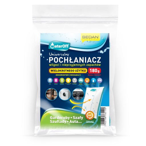 Wielokrotnego użytku pochłaniacz wilgoci waterOff ma bardzo szerokie zastosowanie. Dzięki jego niewielkim rozmiarom, możesz go włożyć do szafy, garderoby, komody na ubrania, półkę na buty, torby sportowej czy walizki – wówczas ochroni Twoją odzież przed wilgocią i zapachem stęchlizny.
