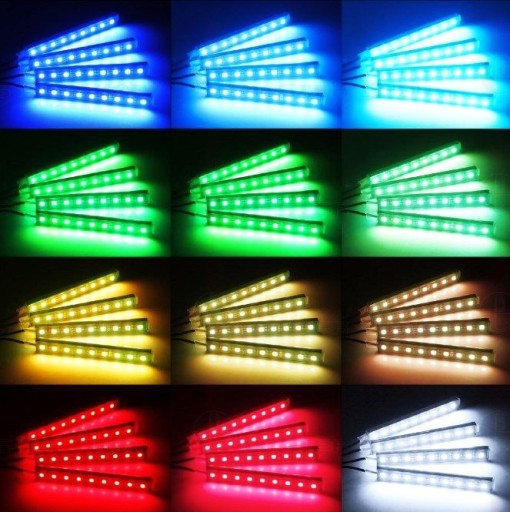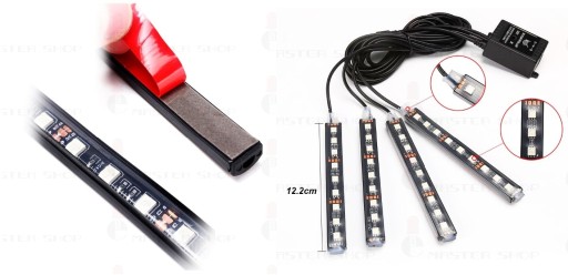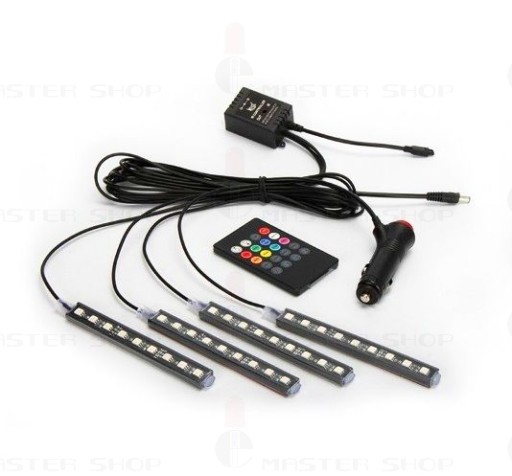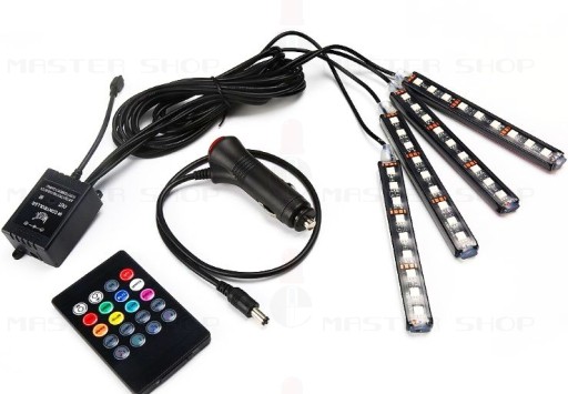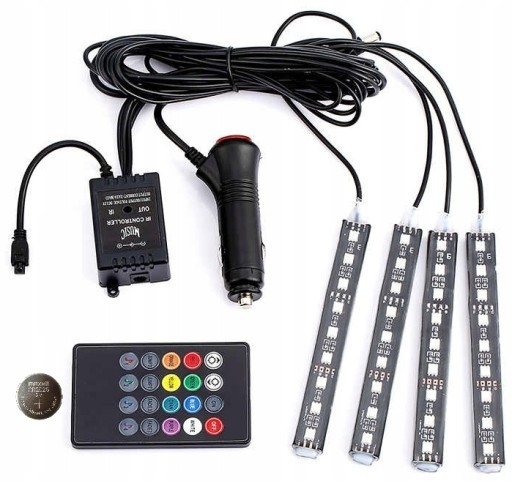 ZESTAW 4x9 LED DO OŚWIETLENIA WNĘTRZA SAMOCHODU REAGUJĄCY NA DŹWIĘK Z PILOTEM NA PODCZERWIEŃ I BATERIĄ