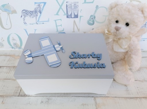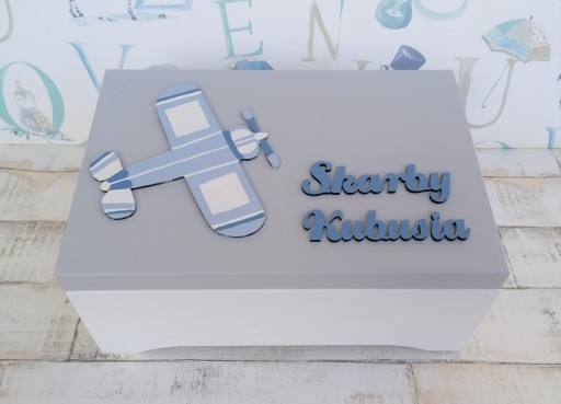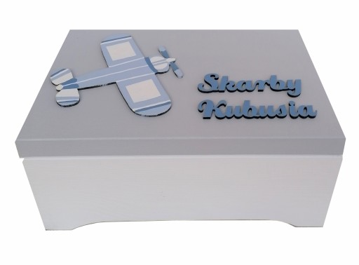 Elementem dekoracyjnym jest niebieski samolot i napis Skarby Kubusia. Oczywiście w tym miejscu napiszemy dla Ciebie GRATIS każde imię wskazane w uwagach.
