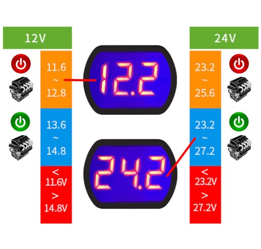 Tabela pomiaru napięcia w samochodzie 12V lub 24 V:
