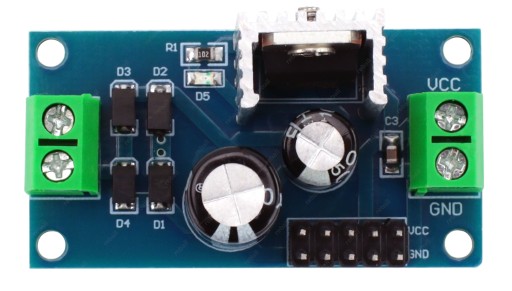 Moduł oparty jest na liniowym stabilizatorze napięcia LM 7805 w obudowie TO-220 i dodatkowo wyposażony w radiator.