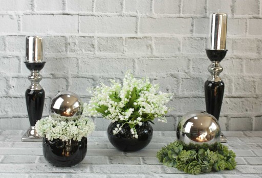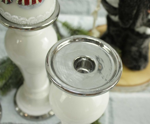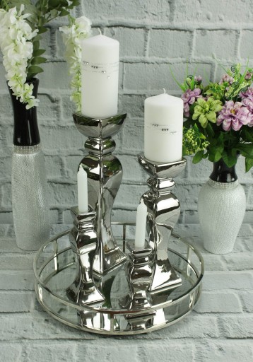 Świecznik posiada klasyczny kształt, który z kolorem srebrnym tworzy nowoczesną, a zarazem uniwersalną kompozycję. Takie połączenie gwarantuje elegancję na stole, komodzie czy półce. Powierzchnia jest gładka, z subtelnym połyskiem.
