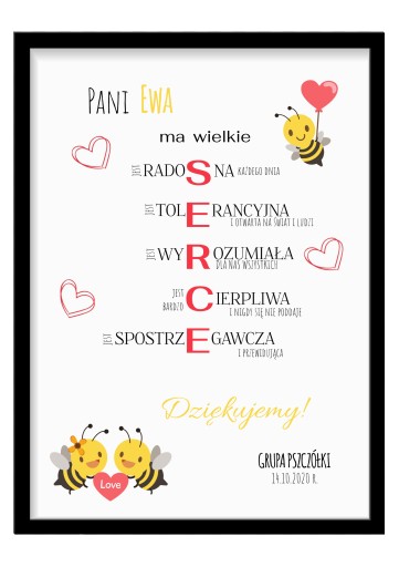 - Po zakupie prosimy o podanie koloru ramki (biała lub czarna), nazwy wybranego wzoru, nazwy grupy oraz danych nauczyciela.