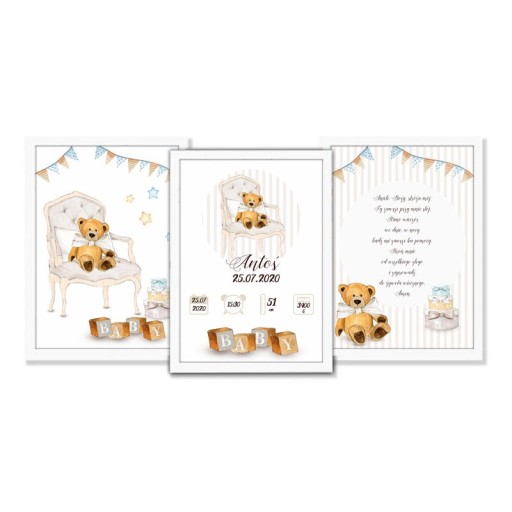 Fantastyczna dekoracja pokoju dziecka w postaci personalizowanych plakatów. W komplecie znajduje się metryczka dziecka, modlitwa oraz plakat z grafiką misia. Całość zawieszona na ścianie prezentuje się cudownie.