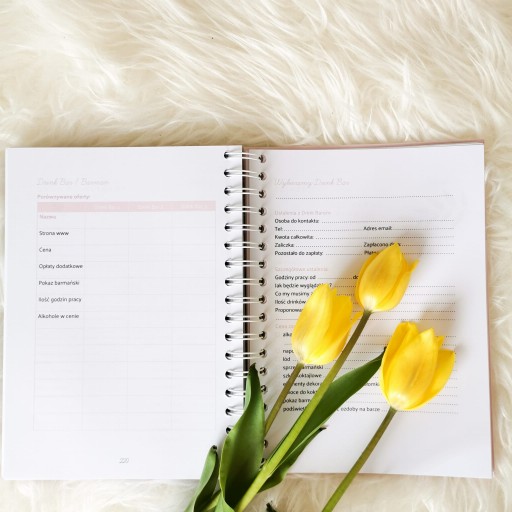 Znajdziecie tu dużo miejsca na porównanie ofert usługodawców, spisanie wszelkich ustaleń oraz danych kontaktowych. Łatwo podejmiecie decyzję m.in. co do sali weselnej, fotografa, florystyki, drink baru, zaproszeń ślubnych, fotobudki, a nawet Panna Młoda zaprojektuje własną suknię ślubną!