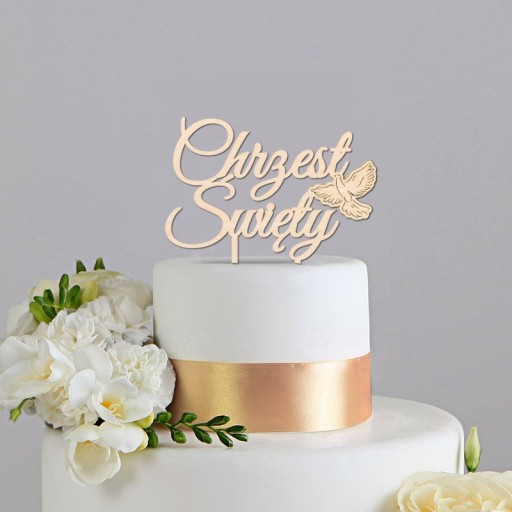 - topper na tort przedstawiający napis Chrzest Święty, dodatkowo dekorowany motywem gołąbka