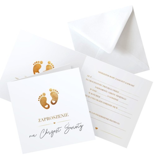 - zaproszenia wykonane są w biało-złotej kolorystyce i dekorowane grafiką złotych stópek