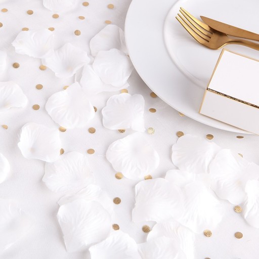 Białe płatki róż wykonane z materiału idealnie nadają się do rozsypania na stole jako konfetti. Pięknie wyglądają między zastawą i uzupełniają każdą aranżację. Szczególnie polecane do aranżacji z okazji Chrztu, Komunii lub ślubu.