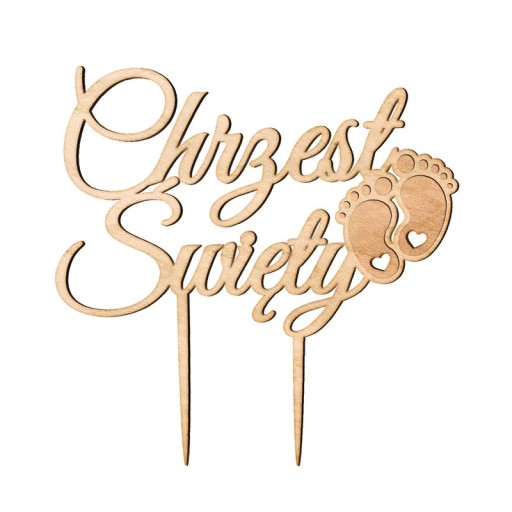 - drewniany topper na tort przedstawiający napis Chrzest Święty, dodatkowo dekorowany motywem dziecięcych stópek