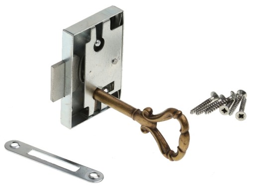 Zamek meblowy nakładany mocuje się od wewnętrznej strony mebla. Zamek pokryty jest warstwą cynku.