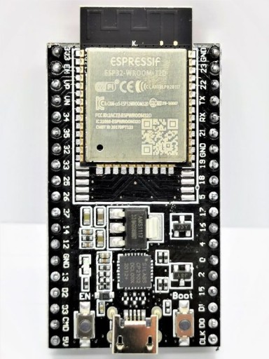 Płytka ESP-32 z wbudowanym modułem ESP32-WROOM-32D. Układ z rodziny ESP32 umożliwia komunikację poprzez sieć WiFi w paśmie 2,4 GHz oraz w standardzie Bluetooth v 4.2. Układ posiada 30 wyprowadzeń wraz z popularnymi interfejsami, m.in: UART, SPI, I2C.