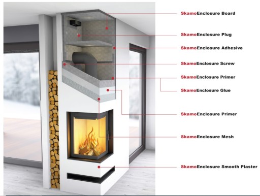 SkamoEnclosure Board to lekka, niepalna płyta budowlana, która ułatwia proces budowy, eliminując konieczność konstrukcji ściany stalowej lub drewnianej. Na skutek tego powstaje kompletny system do obudowy kominkowej z wieloma różnymi rozwiązaniami projektowymi i możliwościami wykańczania.