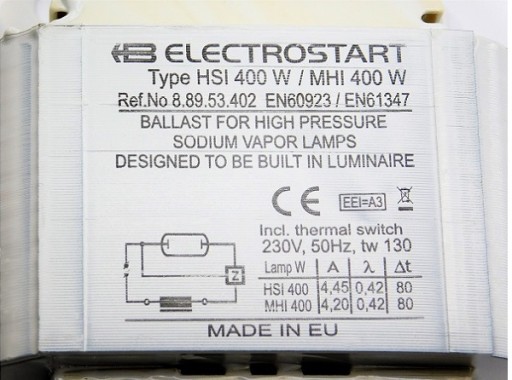 Statecznik indukcyjny (magnetyczny) MHI 400W / HSI 400W firmy ELECTROSTART, w obudowie metalowej, przeznaczony jest do zasilania jednej lampy metalohalogenkowej lub sodowej o mocy 400W.