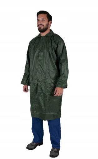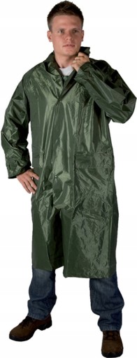 Wytrzymały, całkowicie wodoodporny płaszcz przeciwdeszczowy z kapturem chowanym w kołnierzu. Klejone szwy oraz wentylacja na plecach i pod pachami. W środku rękawa elastyczna błona zapobiegająca opadaniu rękawa, a przede wszystkim wlewaniu się wody nawet podczas uniesienia rąk do góry. Płaszcz posiada 2 kryte kieszenie. Zapinany na napy. Każda sztuka dostarczana w praktycznym, ułatwiającym transport opakowaniu.