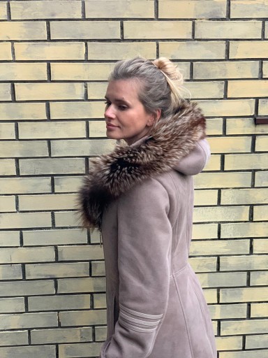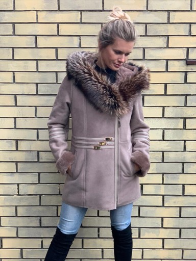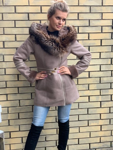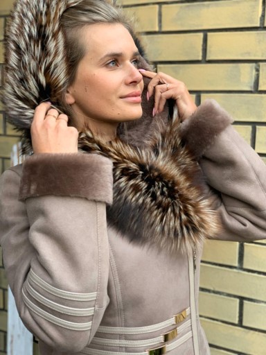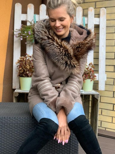 Naturalny kożuszek z miękkich skór owczych w kolorze beżowym. Posiada kaptur obszyty lisem farbowanym. Zapinany z boku na dwa zamki z możliwością regulacji. Wykończony skórą licowaną, która użyta jest także do ozdoby w talii i na rękawach. Dodatkowo z przodu złote blaszki. Kożuszki występują w rozmiarach S, M, L, XL, XXL.