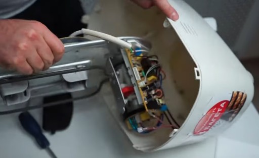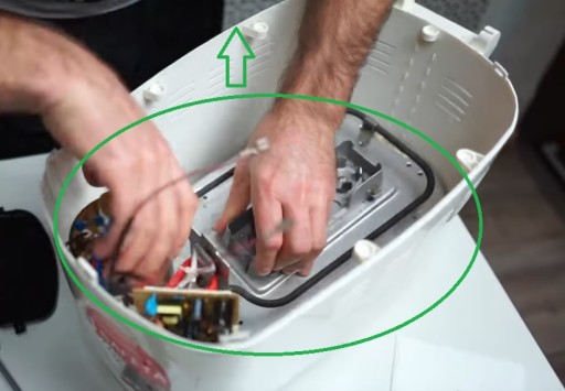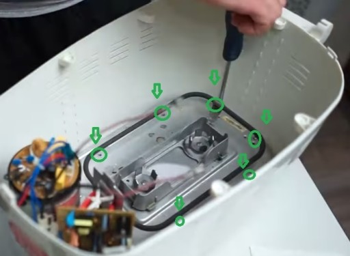 wykręć zaznaczone śruby mocujące blaszany wkład razem z grzałką
