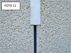 Montaż: Listwa PCV BP15 typu E składa się z dwóch białych kątowników, szarej dylatacyjnej membrany PCV oraz siatki szklanej. Listwę BP15 typu E stosuje się do wykonania dylatacji w płaskiej elewacji. Montaż listwy odbywa poprzez umieszczenie w szczelinie dylatacyjnej szarej membrany pozostawiając szczelinę o szerokości ok. 5mm (FOTO 6). Listwę należy wkleić na krawędziach styropianu. Następnie przykryć zbrojącą siatką elewacyjną pasy siatki szklanej w które zaopatrzona jest listwa BP15 (FOTO 7, FOTO 8) i zatopić w kleju. Wklejenie listwy oraz przykrycie „na zakład” siatki należy wykonać w jednej operacji klejenia. Po wyschnięciu kleju, zagruntowaniu, można rozpocząć tynkowanie (FOTO 9).