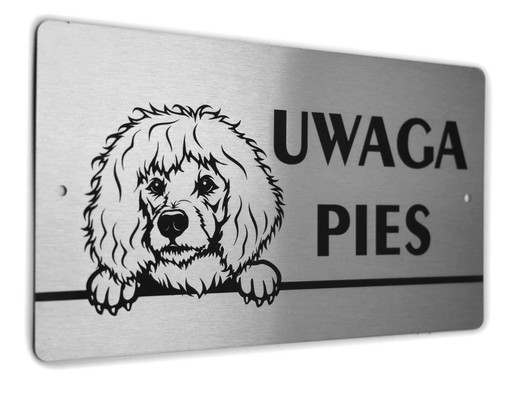 Tabliczka ostrzegawcza z napisem UWAGA PIES i wizerunkiem psa rasy Pudel