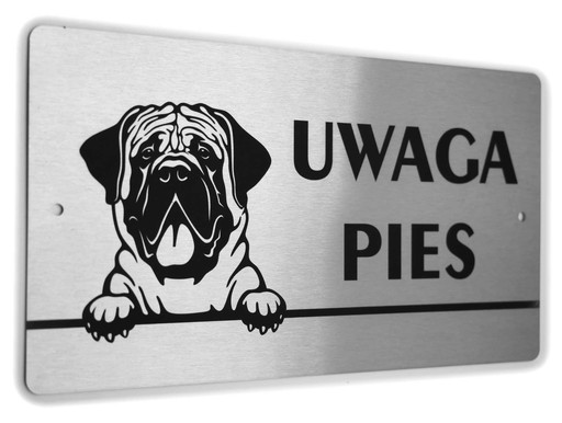 Tabliczka ostrzegawcza z napisem UWAGA PIES i wizerunkiem psa rasy Mastif Angielski