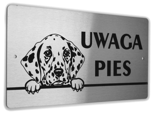 Tabliczka ostrzegawcza z napisem UWAGA PIES i wizerunkiem psa rasy Dalmatyńczyk