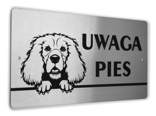 Tabliczka ostrzegawcza z napisem UWAGA PIES i wizerunkiem psa rasy Cocker Spaniel