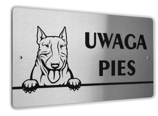 Tabliczka ostrzegawcza z napisem UWAGA PIES i wizerunkiem psa rasy Bulterier