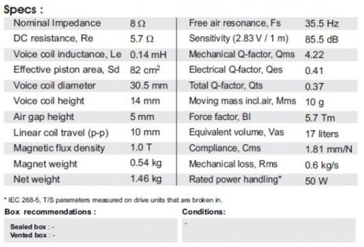 - basreflex z rurą o średnicy około 38 mm i długości 152 mm, objętość około 10 litrów dla F3 wynoszącego 46 Hz.