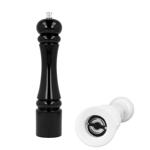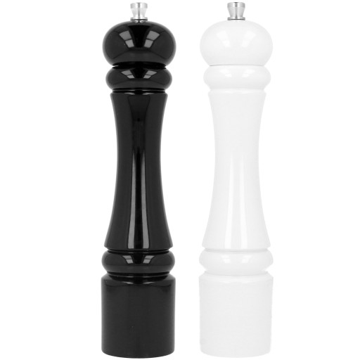 - Drewniane młynki do pieprzu i soli o wymiarze 25 cm w kolorze białym i czarnym - z metalowym mechanizmem mielącym.