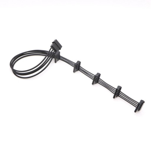 Dzięki temu kablowi można podłączyć do pięciu urządzeń wymagających zasilania SATA do złącza zasilacza MOLEX. Kabel ten znajduje zastosowanie przy podłączaniu urządzeń standardowych HDD oraz SSD, zarówno 2.5" jak i 3.5" oraz nagrywarek DVD-ROM/CD-ROM z wtykami zasilacza typu SATA. Długość całkowita 55cm, odległość od złącza Molex do pierwszego złącza SATA 20cm, odległość między złączami SATA 8cm.