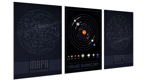 ZESTAW 3 PLAKATÓW W ANTYRAMACH A3 Z MAPĄ NIEBA PÓŁNOCNEGO, POŁUDNIOWEGO ORAZ UKŁADEM SŁONECZNYM (WYSOKOŚĆ ZESTAWU TO 42 CM, A ŁĄCZNA SZEROKOŚĆ 89,1 CM)