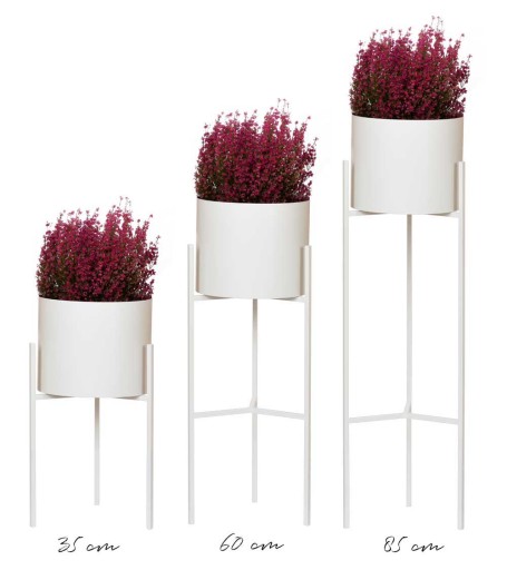 Przedmiotem aukcji jest biały stojak wraz z białą metalową osłoną na donicę. Stojak jest dwustronny, donicę można ustawić na wyższych lub niższych nóżkach. Na zdjęciu donica z aukcji 45 cm oraz wyższa 60 cm, dostępna na innej aukcji.