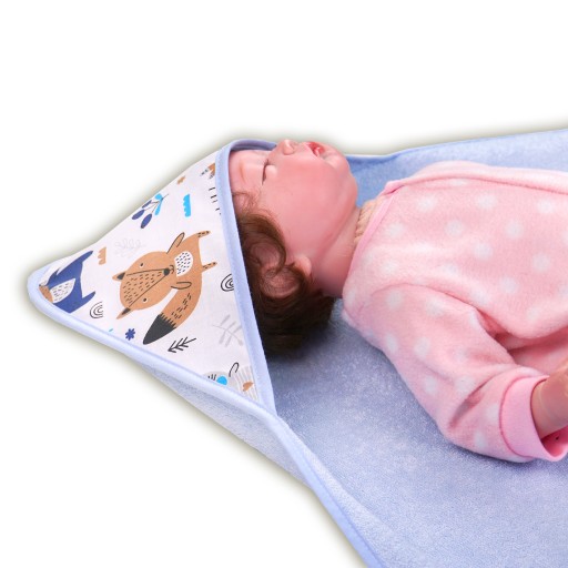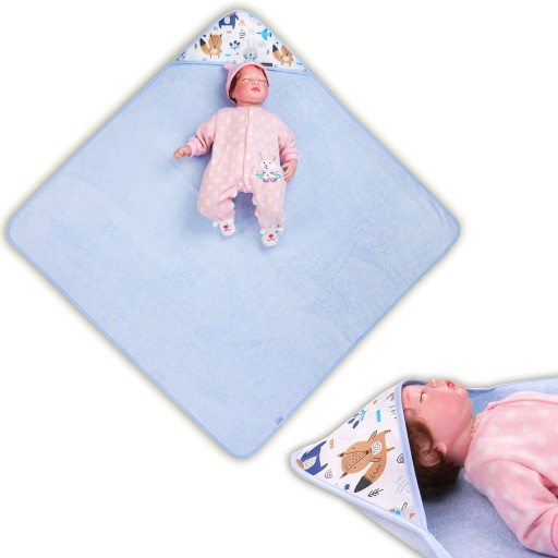 Okrycie posiada na kapturku nadruk z postaciami, które podobają się dzieciom, dzięki czemu dzieci chętnie go używają i nie ma problemu z owijaniem nim dziecka.