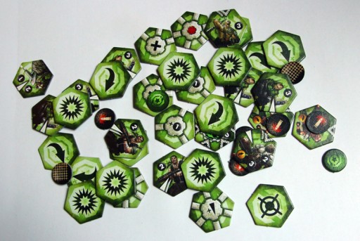 Każda armia składa się z 35 żetonów, na które składają się żetony jednostek oraz akcji specjalnych. Jednostki wykłada się na planszę, na dowolnym polu nie zajętym przez inny żeton. Każda z nich ma oznaczenie informujące, czy jest jednostką strzelającą czy walczącą wręcz a także inicjatywę (o wartości od 0 do 3). Na żetonie znajdują się także symbole oznaczające z jaką siłą i w jakie kierunki atakuje. Niektóre jednostki mają zdolności specjalne, np. „Sieciarz może zablokować działanie sąsiadującej jednostki, inne mogą atakować dwukrotnie, jeszcze inne mają zamontowany pancerz itp. Symboli jest niewiele, są czytelne i bardzo łatwo się w nich połapać - nie trzeba ich nawet specjalnie znać przed rozgrywką. Przykładowe żetony można zobaczyć w galerii poniżej.