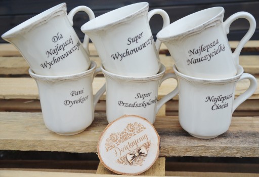 - napisie na kubku (Super Nauczycielka, Pani Dyrektor, Najlepsza Wychowawczyni, itd),