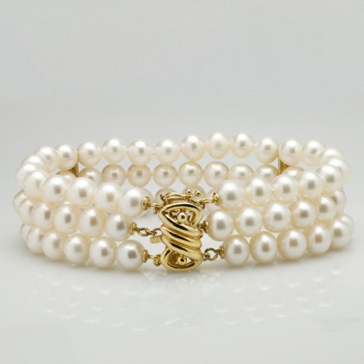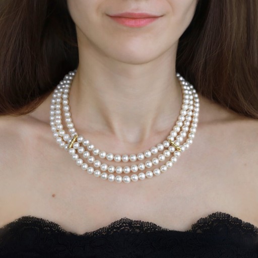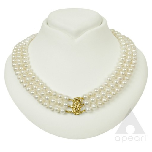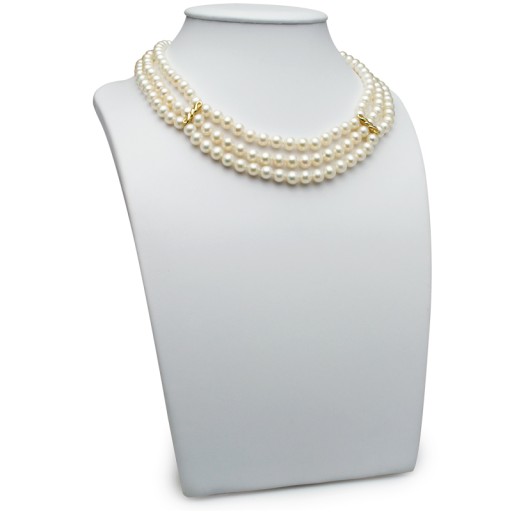 Niepowtarzalny, 3-rzędowy, ręcznie wykonany naszyjnik z prawdziwych pereł hodowanych słodkowodnych. Nietypowe, potrójne zapięcie ze złota pełni funkcję ozdobnego wykończenia.